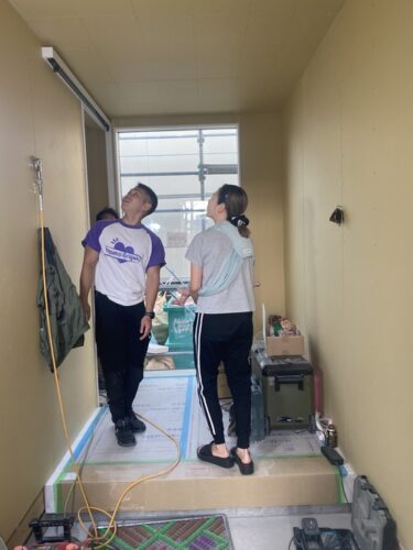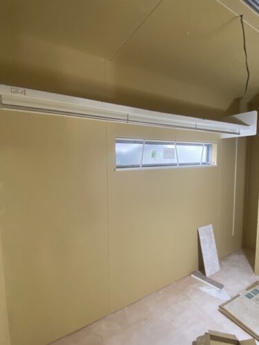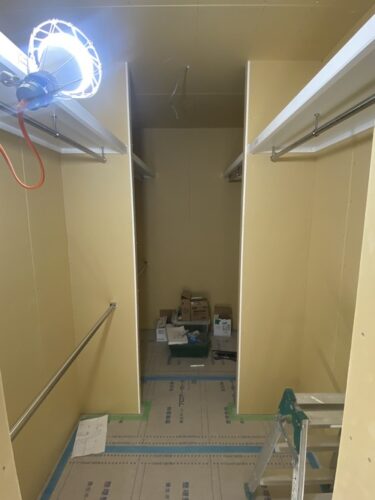内部では、大工の田上棟梁が、収納関係の枕棚とハンガーパイプをきっちり仕上げてくれていました(写真2枚目、3枚目)。