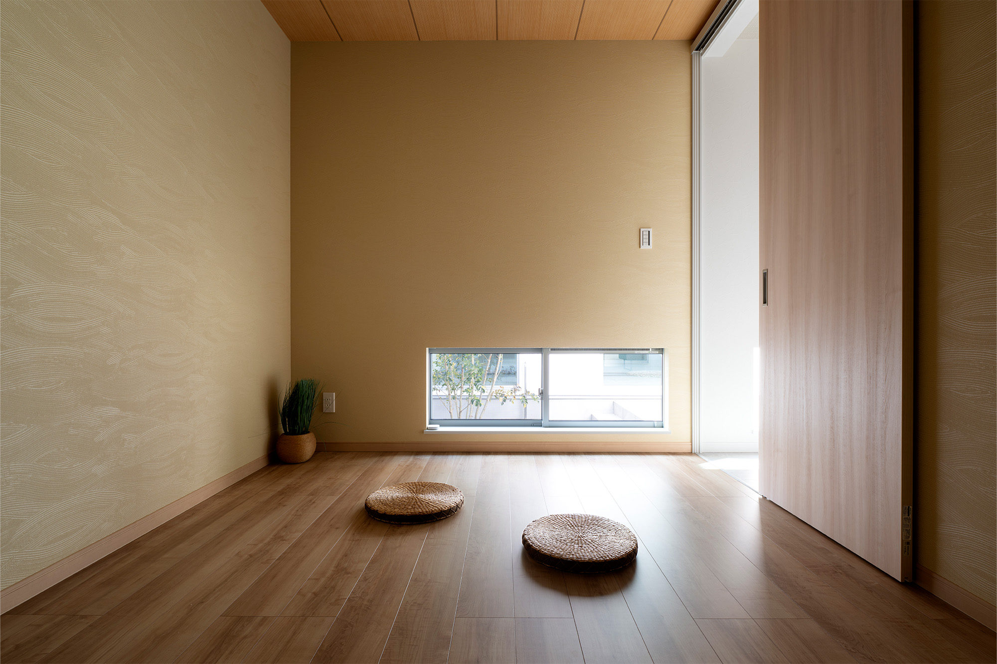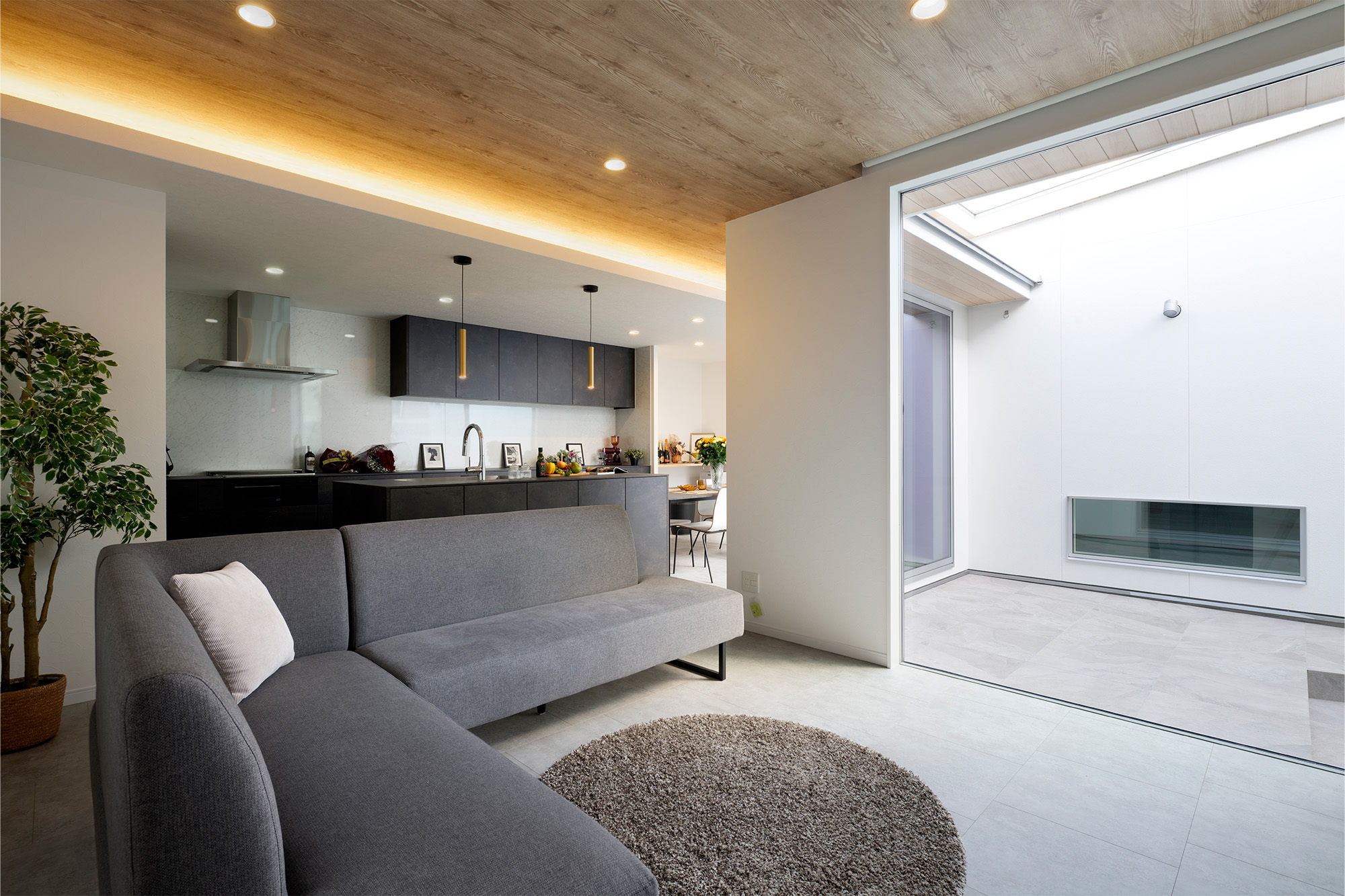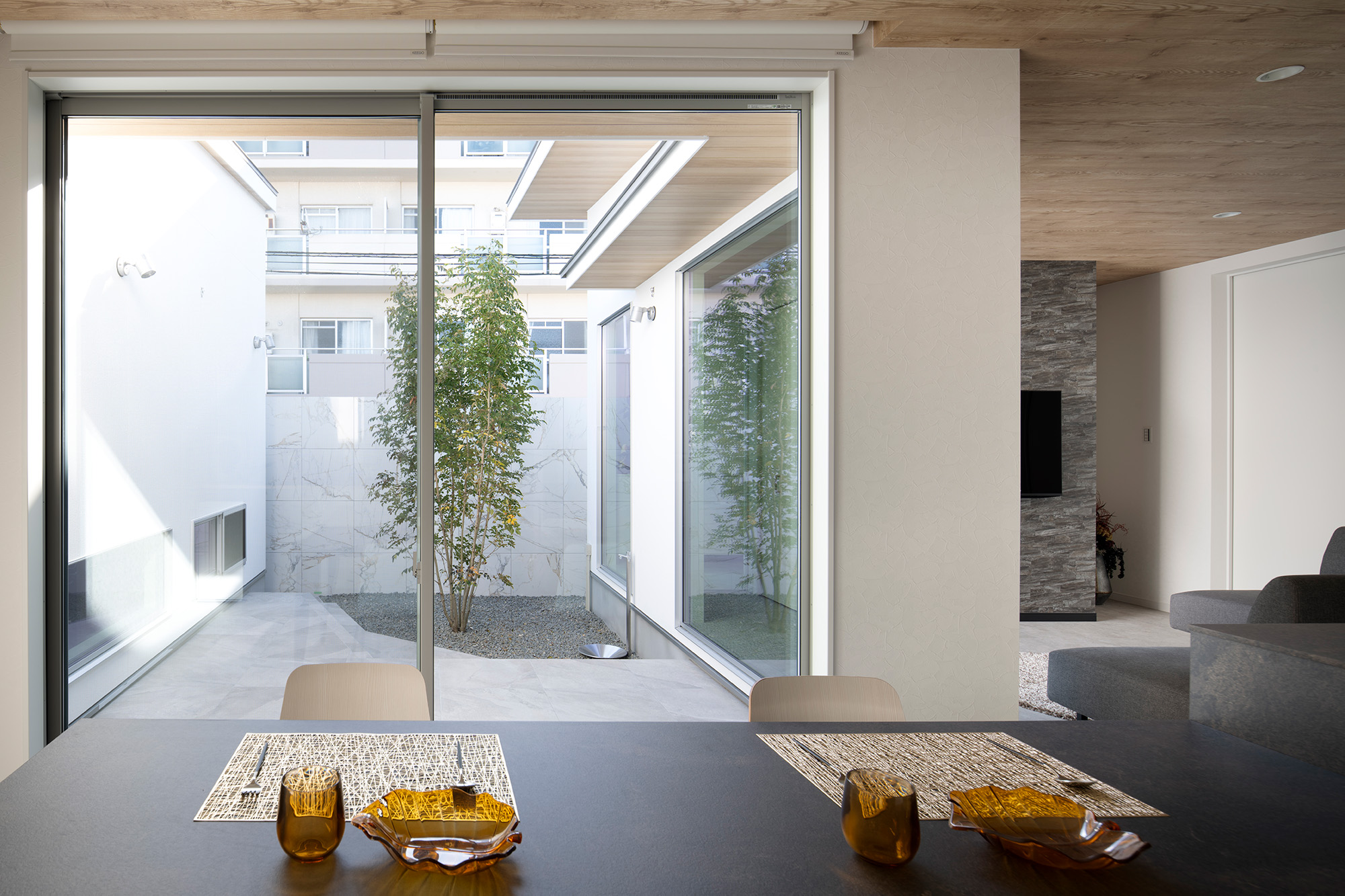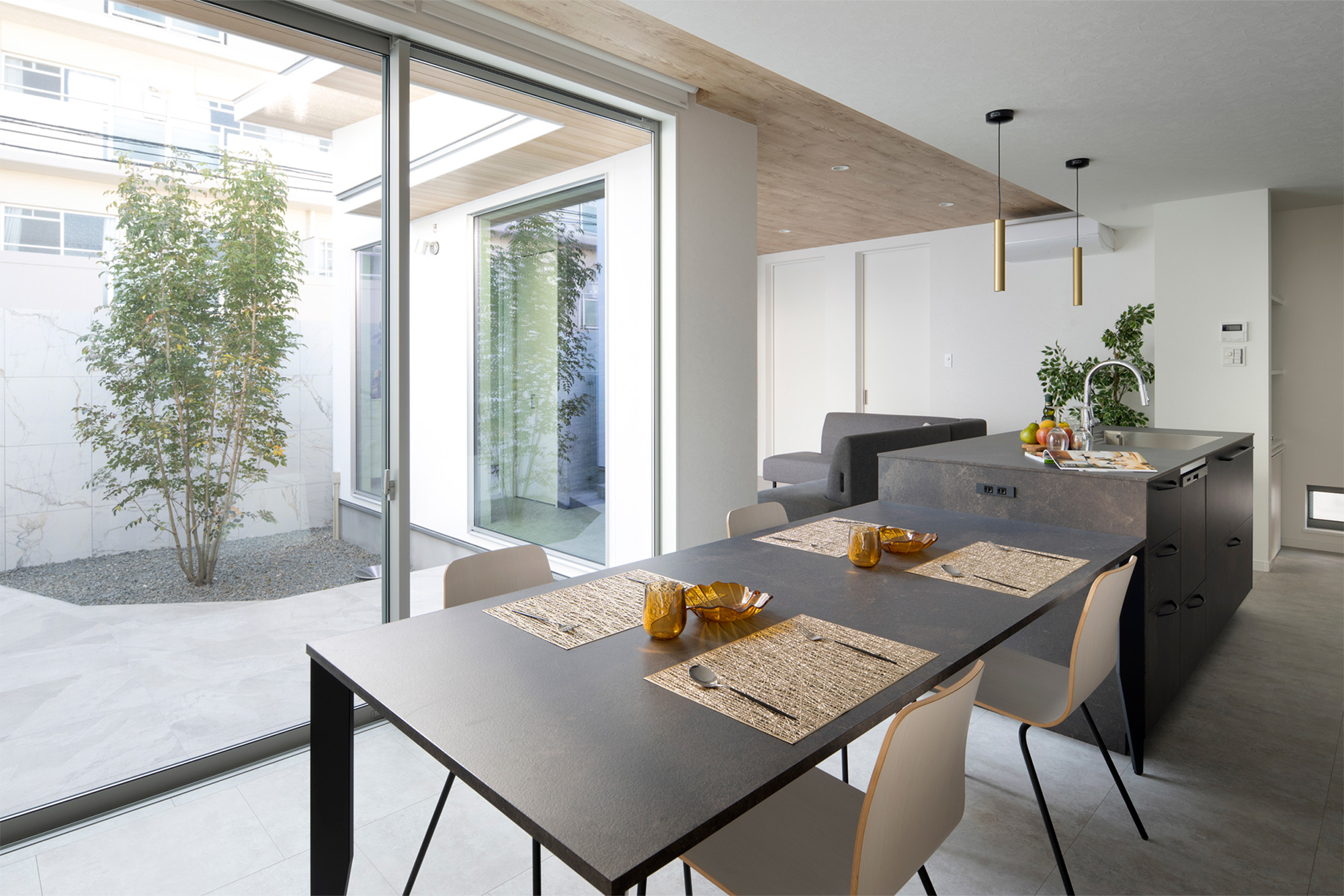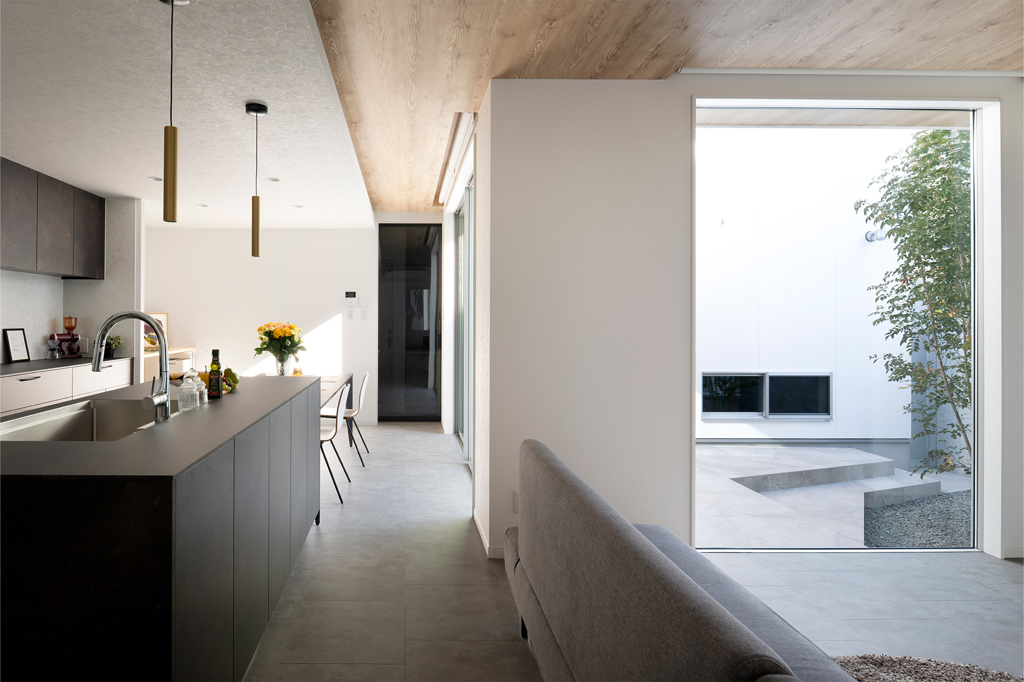 中庭を設けることで、外部からの視線を気にせず大きな開口部を設けることができます。リビングの大きな窓からは中庭の景色が広がり、外に向かって開くのではなく「内に開く」開放的な空間を実現しました。外部環境に左右されないプライベートな屋外空間は、家族のくつろぎの場所としても活躍します。