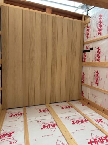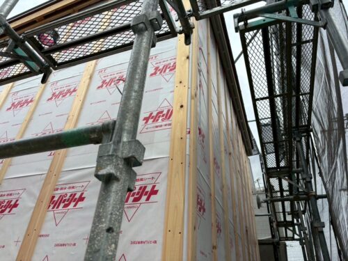 まず、建物の外側を見てください。写真1枚目にもあるように、木材の構造の上に白いシートが貼られています。これは防湿防水シートと呼ばれるもので、家を雨や湿気から守る、非常に重要な役割を担っています。この上から、さらに通気胴縁(つうきどうぶち)という細い木材を縦に取り付け、いよいよ本日よりサイディング(外壁材)の施工が始まります。