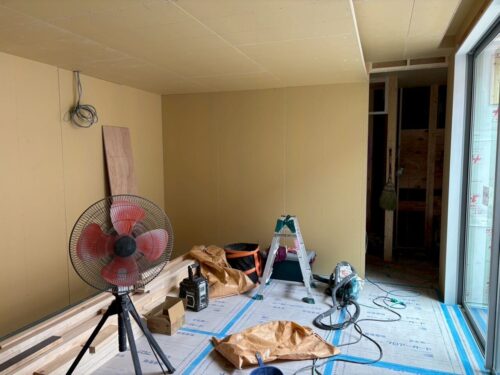 天井一面に、温かみのある木目調のパネル(松材)が施工され始めています。これは、S様ご夫妻のおしゃれなライフスタイルデザインを体現する、こだわりの空間です。木材を使うことで、家の中にいながら自然を感じられる、癒やしの空間が生まれます。
