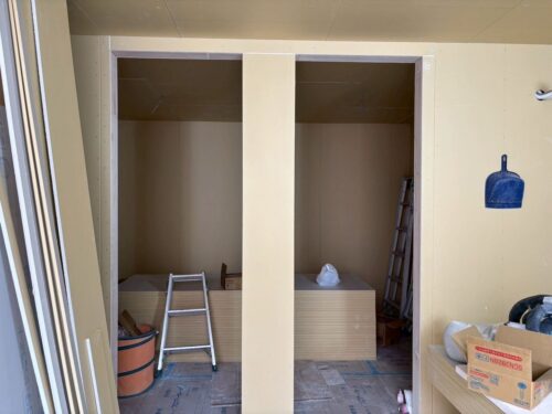 写真のように、収納スペースの開口部ができて、空間の奥行きが感じられるようになりました。S様ご夫妻と打ち合わせを重ねた、こだわりのデザインが着々と実現しているんです。