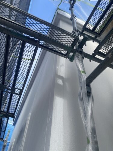 外壁の最終工程の一つ、リシン吹き付けが本日で完了し、