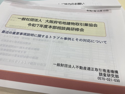 午後からは大阪市内へ移動し、一般社団法人 大阪府宅地建物取引業協会の令和7年度本部相談員研修会に参加しました。