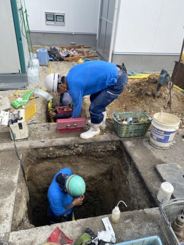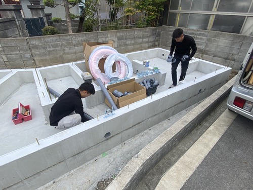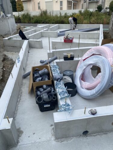 これは、住宅の基礎工事が完了する前に、床下などを通る給排水やガスなどの配管を先に埋設しておく、非常に重要な工程です。大工工事が始まると配管工事が難しくなるため、効率的に進めるために行います。