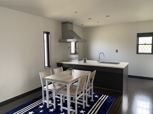 * 写真4(内装):開放感のある明るいリビングダイニング、アイランド型のシステムキッチン。シンプルながらも洗練された、おしゃれなライフスタイルデザインを実現します。