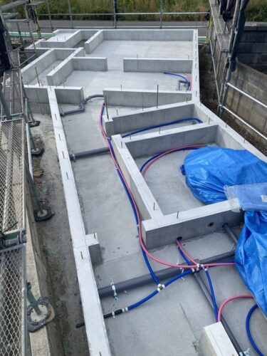 複雑な形状のコンクリート基礎と、青・ピンクの給水管、グレーの排水管が配置された先行配管の様子