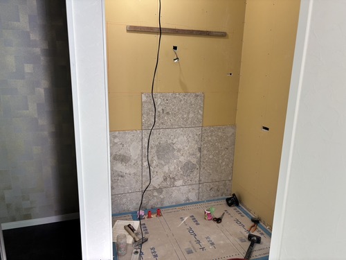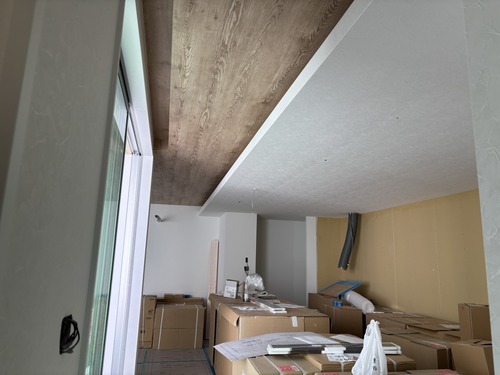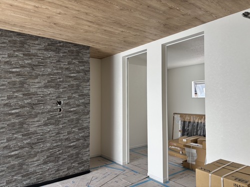 つい先日までボードが貼られていた壁や天井に、本日はついにクロスが貼られ、一気に「おうちの顔」が見えてきました。現場は、養生のために床材が保護された状態で、完成を待つばかりの凛とした空気感に包まれています。