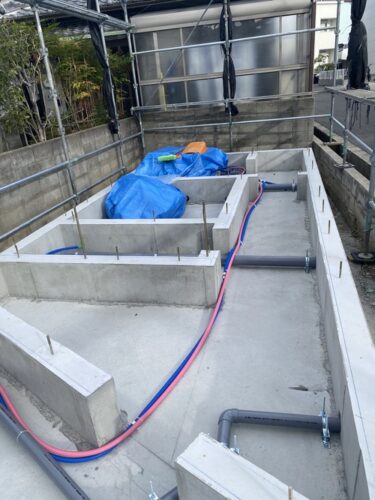 現場に到着すると、鉄骨のしっかりとした足場が組まれ、同時に建物の周囲や基礎の下となる部分には、先行配管工事が完了していました。青やピンクのパイプは給水・給湯用、そしてグレーの太いパイプは排水用の管です。これらを土台や基礎の下に先に仕込んでおくことで、後の工事がスムーズかつ確実に進められます。
