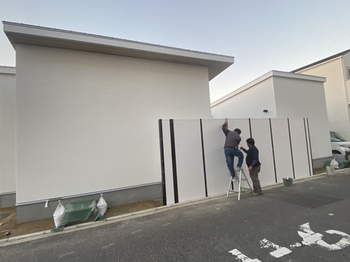 写真にもあるように、美しい白の塗り壁(アウターウォール)が印象的な外観。このアウターウォールには、後ほどタイルも施工される予定です。プライバシー保護とデザインの両立は、IE LAB♡の平屋の重要なテーマ。