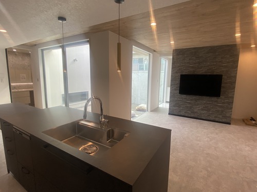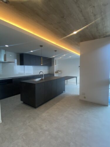まさに「ライフスタイルデザイン」の中心です。深みのあるマットなメルクリオのキッチンカウンターに、上質な仕上がり、そして間接照明とスポットライトが織りなす光の演出。
