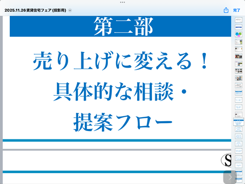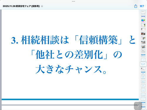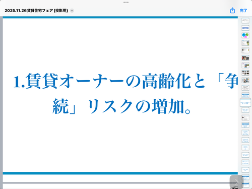 講演の骨子は、添付写真のスライドにもある通り、「賃貸管理における相続問題の現状と機会」、そして「相続相談を売り上げに変える具体的なフロー」に焦点を当てました。