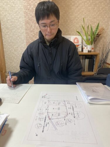 • プラン造りの件: 土地の形状(境界)を読み解き、風の流れや光の入り方をその場で図解します。