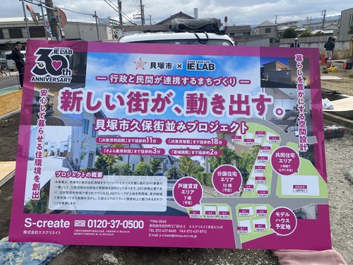 まずはこちらの大きな看板をご覧ください。貝塚市久保にて、行政と民間が連携する「街並みプロジェクト」が着々と進んでいます。