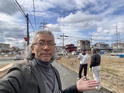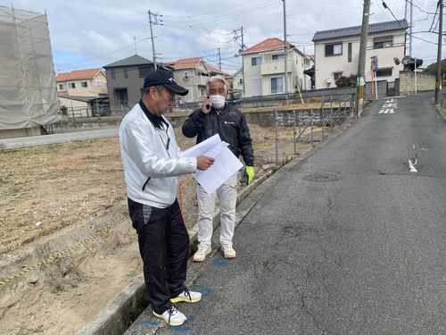 現場では光栄開発の岡田社長や花田土地家屋調査士といった、弊社が長年お世話になっている信頼できるプロフェッショナルたちと密な打ち合わせを重ねております。大手ハウスメーカーの画一的な分譲地とは一線を画す、地形や光の入り方を熟慮した「佇まいの良い街並み」にご期待ください!