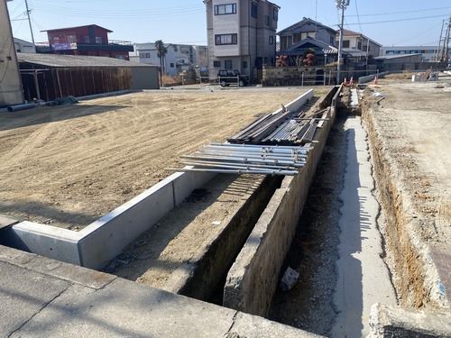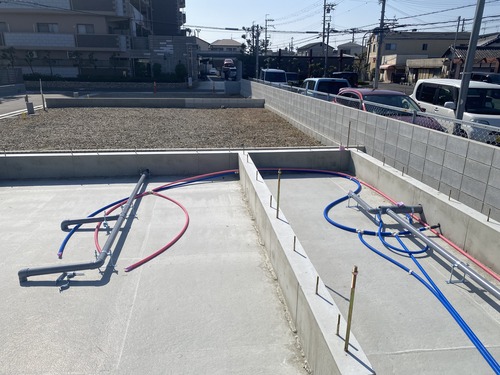 現在は、建物が建つ前に床下のライフラインを整える「先行配管」の工程へと移っております。