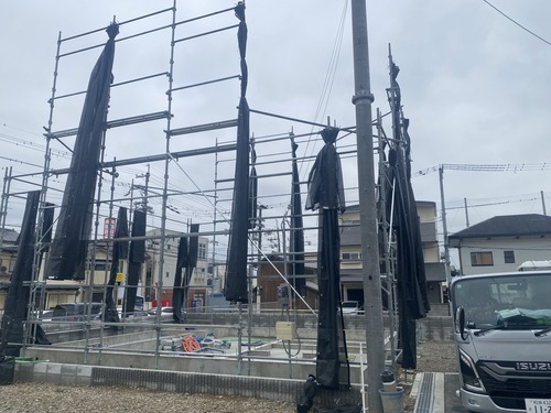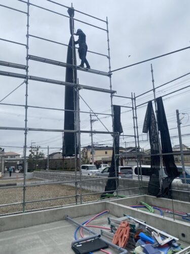 まずは岸和田市上町のI様邸へ。現場では足場が美しく組み上がっていました。