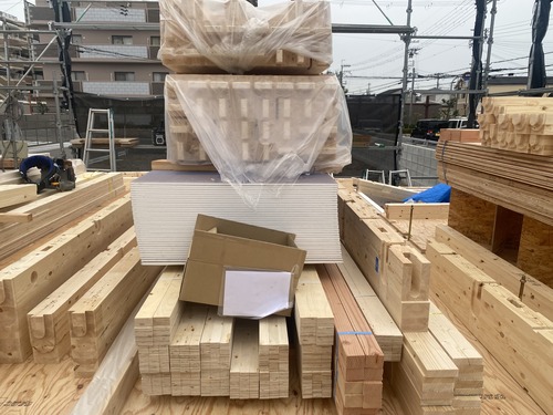現場に到着すると、そこには美しく組み上がった足場。そして、出番を待つ高品質な木材や構造用パネルたちが、整然と並んでいました。