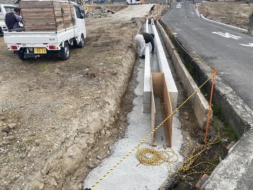 現在は、光栄開発の皆さんの手によって、道路のセットバックや給排水工事、擁壁工事が着実に進められています。