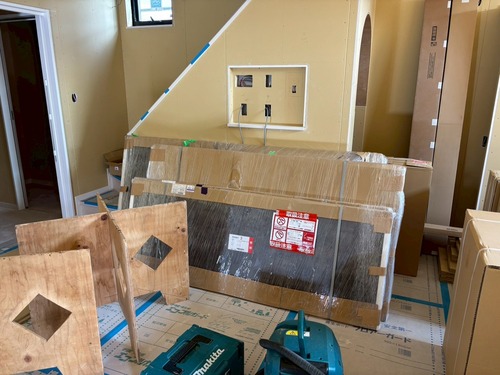 石膏ボードが張られ、内装工事が進む部屋に、山積みの段ボール箱……。